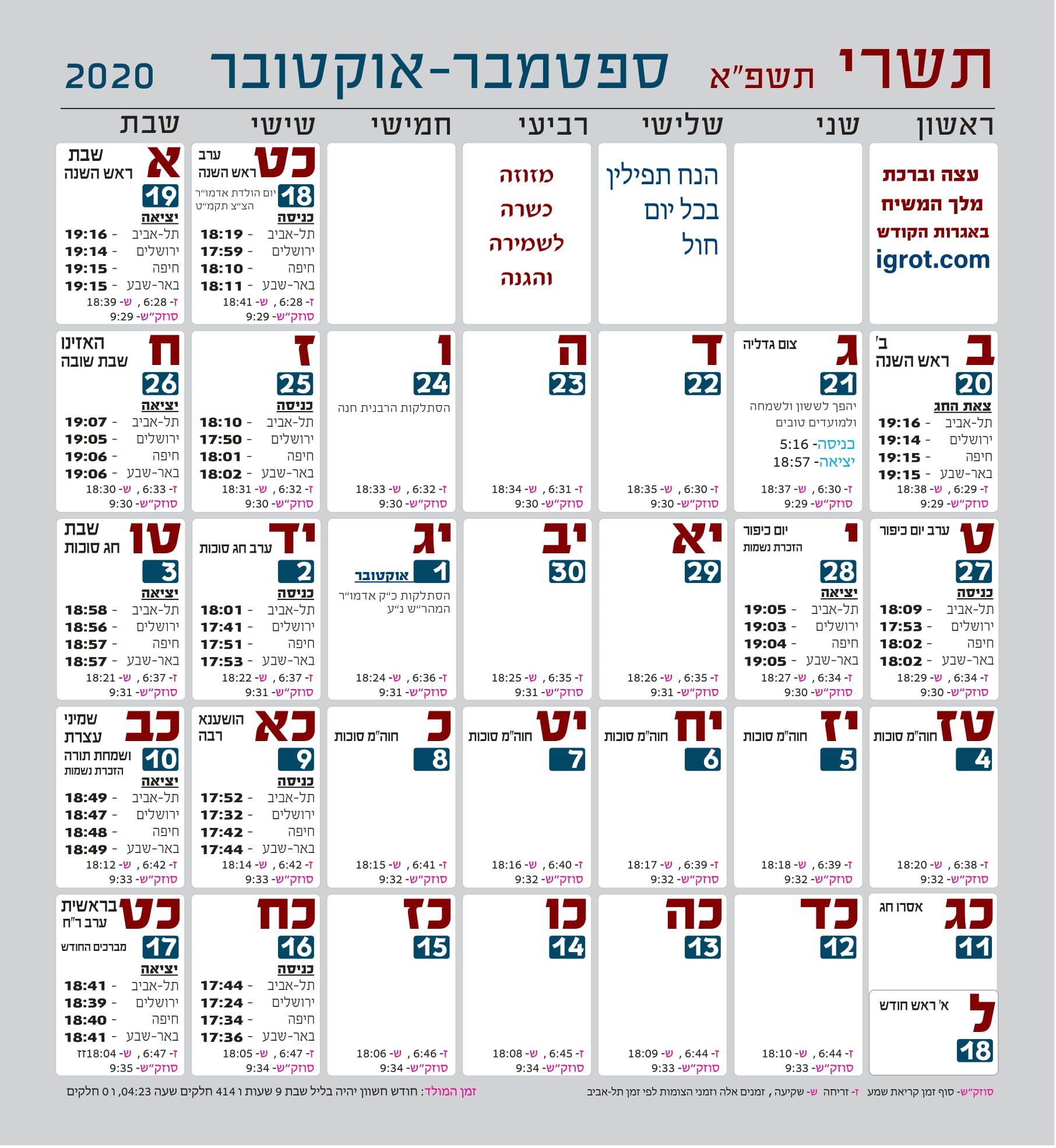 לוח חודש תשרי לשנת ה'תשפ"א